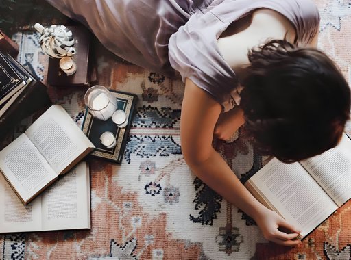 En arrière-plan, un homme et une femme dos à dos et au premier plan, une pile de livres